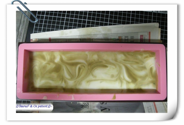 要入模時小海龜醒了,只好匆匆入模,倒入渲染皂液時發現份量取太多了,且我用的長條土司模倒二條長形已是極限,只好盡可能讓中間留有原來的皂液,再翻皂液,然後匆匆畫了幾下就送進保溫箱。