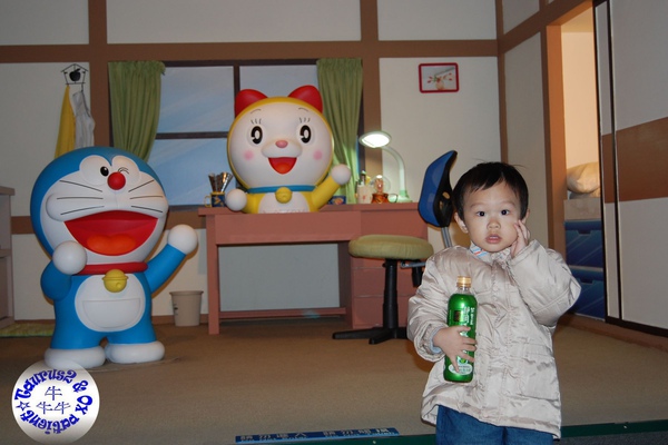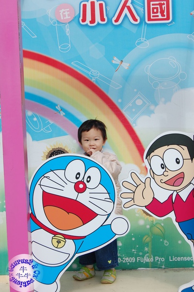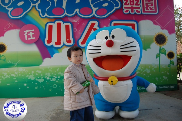早上出門時小海龜還在和周公的孫女玩,接了老媽再往關西開,途中經過六福村後到了小人國, 停好車後小海龜終於醒了,往常剛睡醒的小海龜一向是有些呆呆的,今天一下車看到貼著小叮噹的大型遊覽車停在停車塲一角精神就來了。
