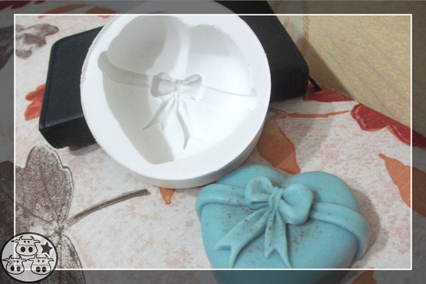 這個母模式是皂友蚊子辣妹的,當時去上龜大的翻模矽膠課時,龜大提供了兩種母模,一種是我拿到的kitty,另一種就是蝴蝶結愛心。當時就很想和一起上課的同學借來翻,可惜當時沒有認識的人。蚊子辣妹是在上個月上捲皂課時認識的,後來得知她也上過龜大的課,拿到的母模是愛心,就像她借來翻。