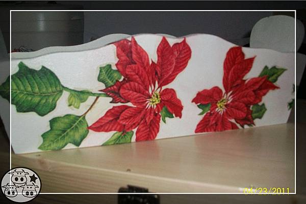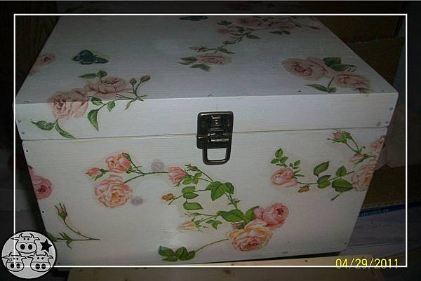 組裝好的木箱,用砂紙磨細後,塗上白色水性底漆,再用細砂紙磨細,這回不是用拼貼膠,而是用白膠加水調和後將餐巾紙黏住,最後刷上三層的水性亮光漆。